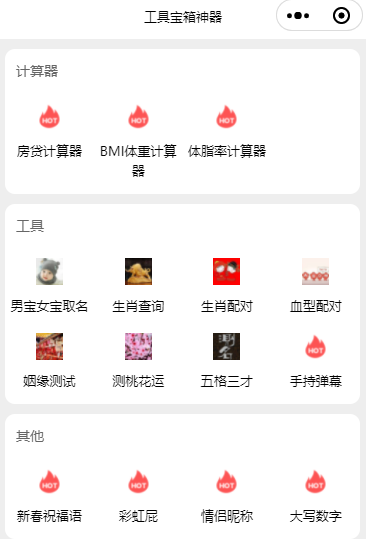 工具宝箱神器小程序:包含房贷计算器,BMI体重计算器,取名,姻缘测试、桃花运、血型配对测试、生肖配对测试;五格三才测试等工具